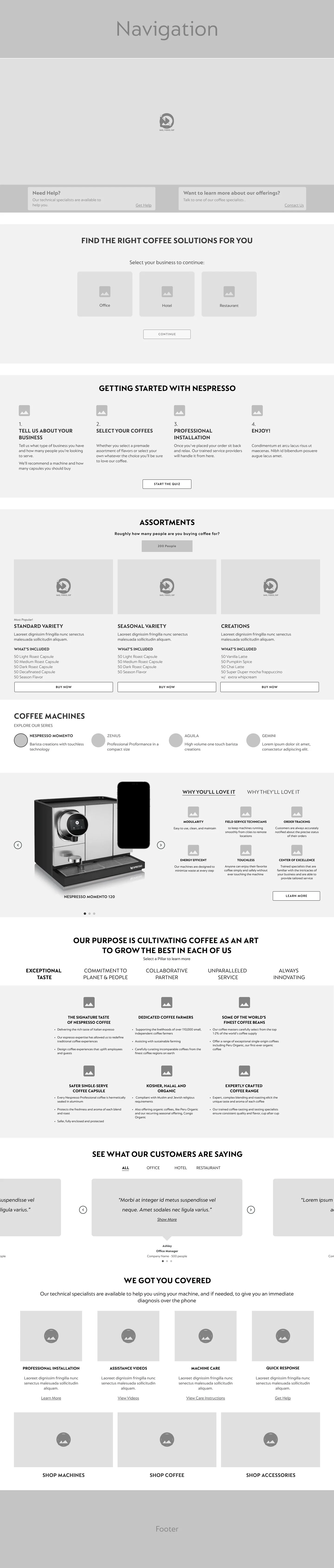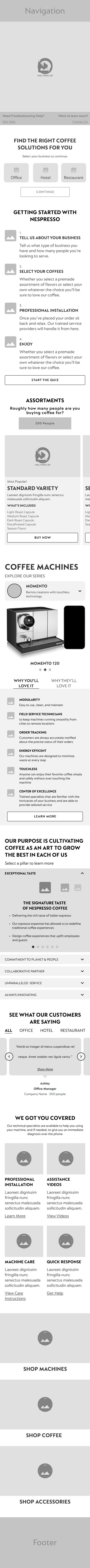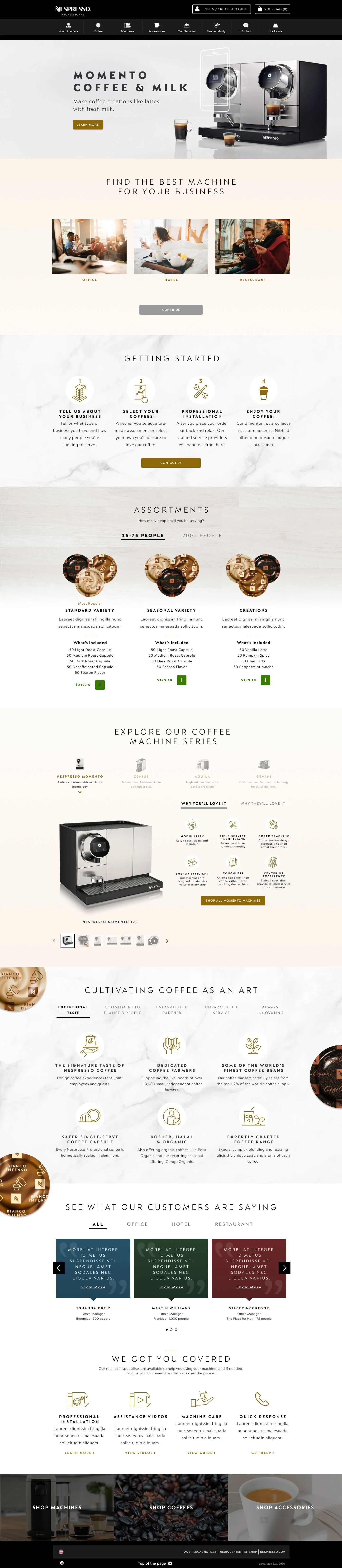 Reassuring users by introducing: how to get started, testimonials, as well as outlining the other services and benefits Nespresso has to offer.