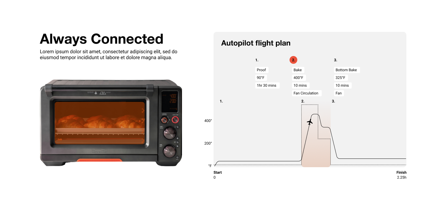 We wanted a gif showing the stages of autopilot along side a item that would be normally tough to bake. This would help demonstrate how easy the product was to use as well as showing that the Oven + App came with many different recipes pre programed in.